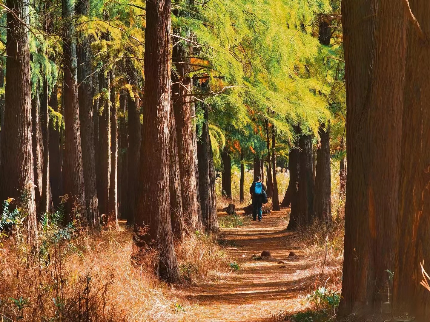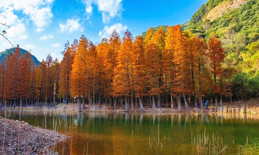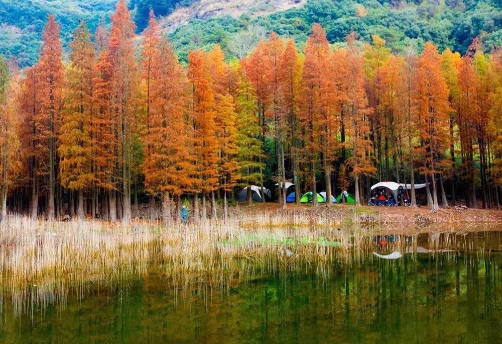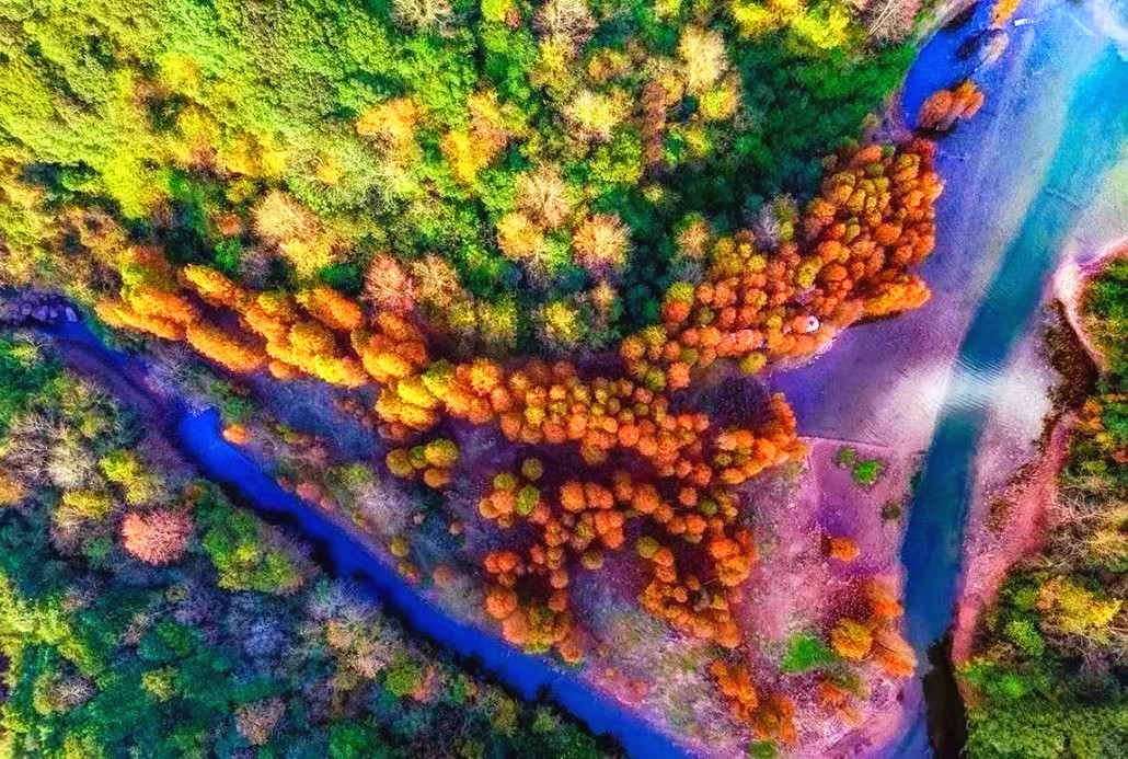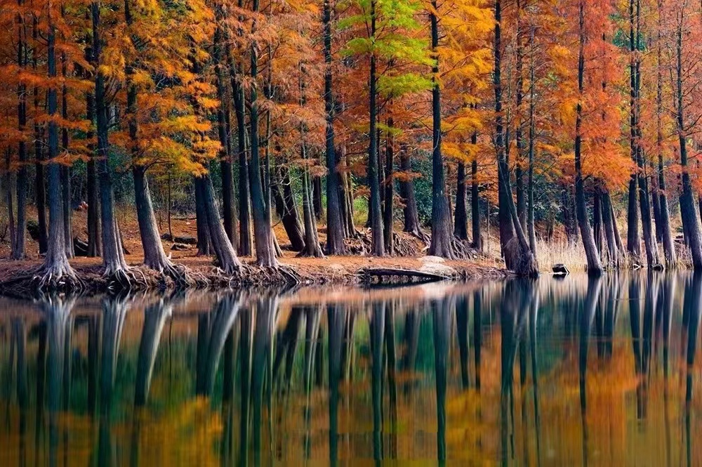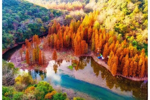卖柴岙位于在鄞江镇的南面。鄞江镇是四明山区通往宁波城的第一大镇。以前奉化溪口一带的人们,到鄞江镇赶集或进宁波城,都是从卖柴岙经过,这里贯通着一条古道。古道的那一边,也是一个山岙,是溪口的状元岙。据说古道那一边溪口的人会读书,出过状元,而古道这一边的鄞江人不会读书,一直以砍柴卖柴为生,所以称为卖柴岙。深深的山坳里,居然隐藏着一片让人为之惊叹的红杉林。初冬深秋时节,这里万山红遍,层林浸染,火红色的水杉树林被绿水青山环绕,仿佛是隐秘在江南喀纳斯。一颗颗红杉树高耸入云,浅红、深红、金红多种色彩交织在一起,在溪水的映衬下显得美丽而壮观。