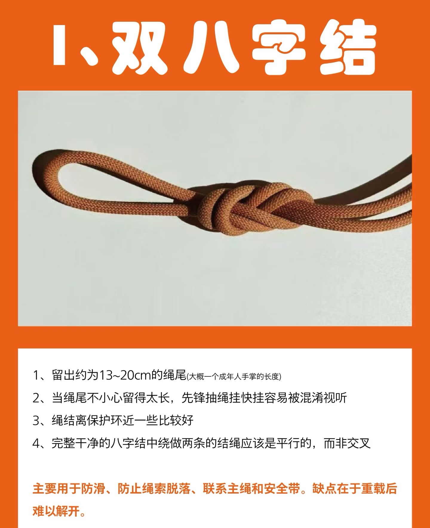 • 双八字结:堪称登山界的‘安全卫士’,把它系在安全带和主绳之间,防滑防脱落,不过重载后解开有点费劲儿,所以打绳结时记得留好13-20cm绳尾哦。