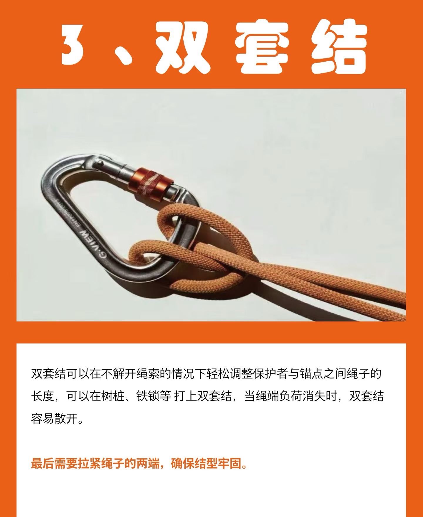 • 双套结:在不解开绳索的情况下,能轻松调整保护者和锚点之间绳子的长度,最后记得拉紧绳子两端,让结形牢牢的。