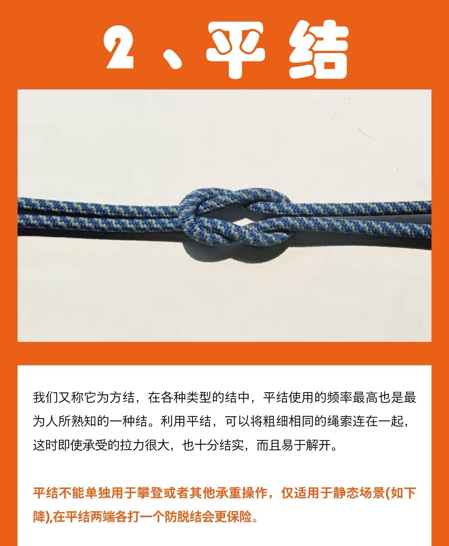 • 平结:也就是咱们常说的方结,把两根粗细差不多的绳子连起来,受力大也很结实,还容易解开。但要注意,它可不能单独用于攀登这类承重操作,只适合静态场景,要是在两端各打个防脱结,就更保险啦。