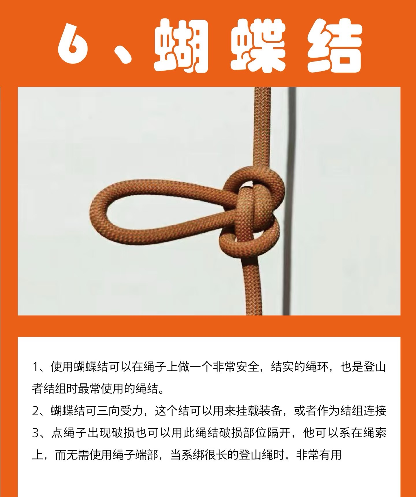 • 蝴蝶结:登山结组常用的绳结,能做个安全结实的绳环,还能三向受力,用来挂载装备或者隔开绳子破损部位都很给力,系很长的登山绳时也特别有用。